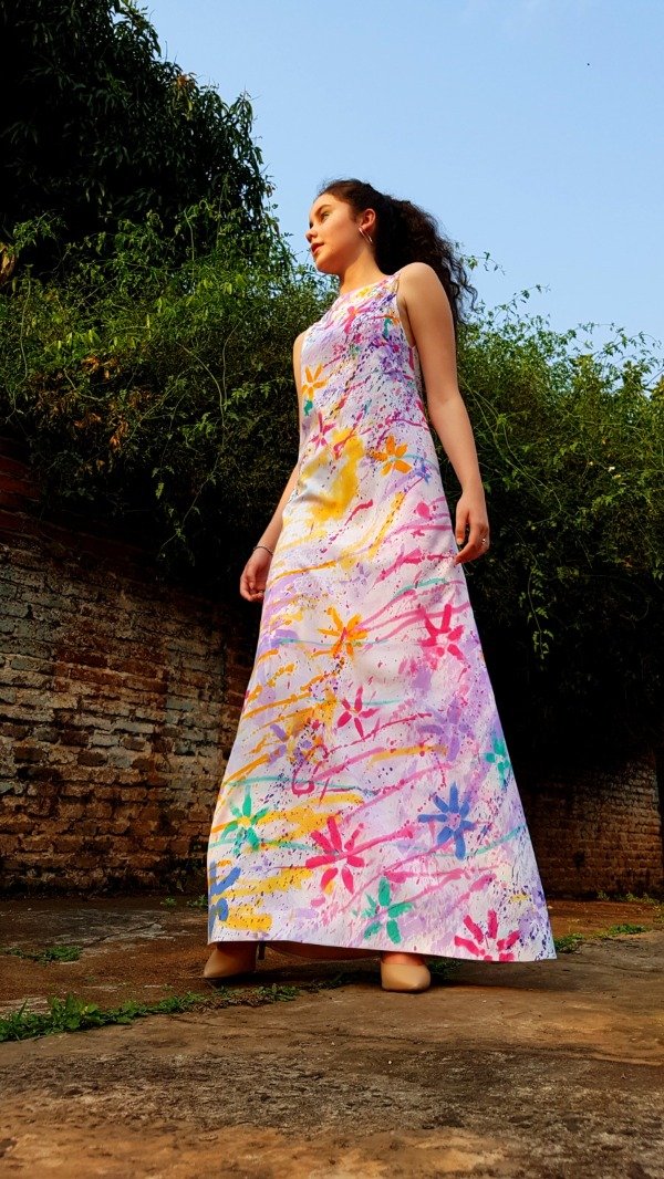 Prenda única! integramente con intervención artesanal "pintado a mano", es un vestido en fibrana de "seda", una de sus características es que no se arruga, es un textil fresco, liviano e ideal para días de primavera/verano. Además, esta completamente forrado.